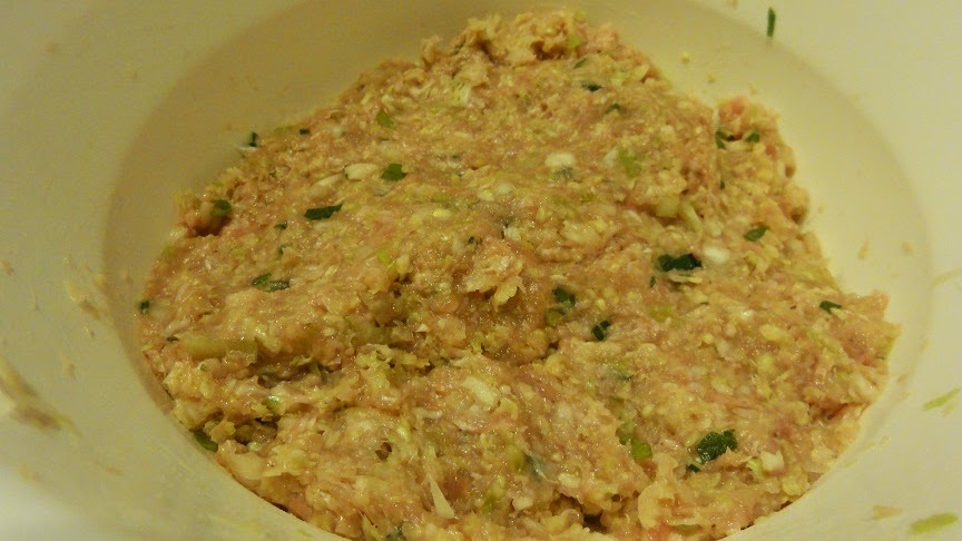 250 g hakket svinekød, 300 g fint hakket kina kål (drys 1 tsk. salt over og lad de hakket kinakål lægge i 10 min.. Put de hakket kinakål ind i et viskestykker for at vride alt væske ud fra kinakål), 1 fint hakket forårsløg, 2 tsk soya sauce, 3 tsk mørk sesam olie, 2 tsk saft af ingefær, 1-2 presset hvidløg, 1/2 tsk salt, lidt peber